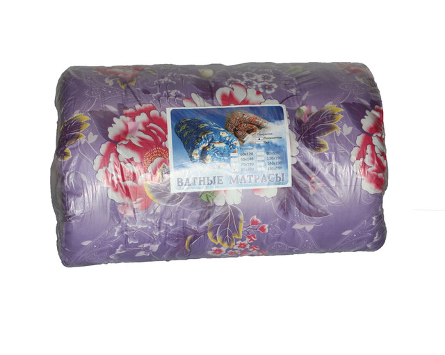 Показати оптові ціниМатрац ватний 120х190х7 з м'яким, теплим, пружним тюф'яним наповнювачем ― у різнобарвному чохлі з полікотону зі щільністю 75 г/м2
